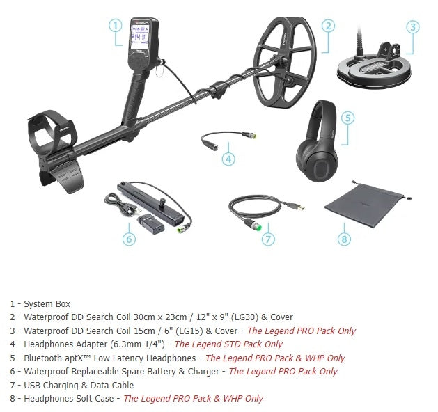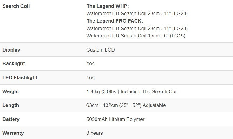 Legend er meget robust bygget med blant annet nedre skaft i karbonfiber. Skaftene er teleskopskaft, så den blir meget liten (63 cm) når den er slått sammen, og tar defor liten plass under transport eller lagring. Hele detektoren er vanntett til 3 meters dyp, kontrollboksen også (IP68).