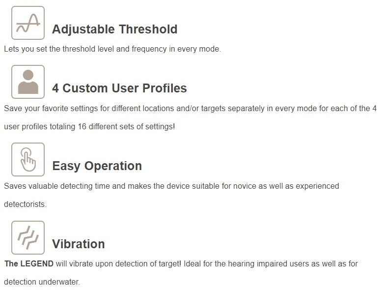 Man blir raskt dus med The Legend. Brukergrensesnittet er gjort enkelt å forstå, slik at også nybegynnere kan starte med denne kvalitets-detektoren. - Vibrasjon