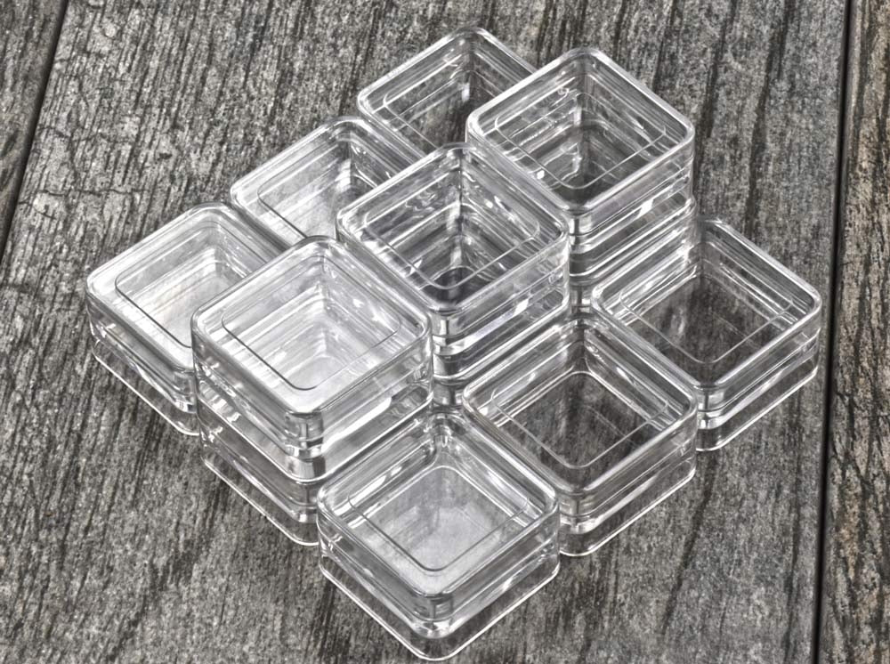 12 Stackable Square Plastic Containers. Our containers are useful for storing or displaying small coins, stamps, gems, beads, seeds, glitter, sequins, pills or anything that you'd need to organize in small containers.
