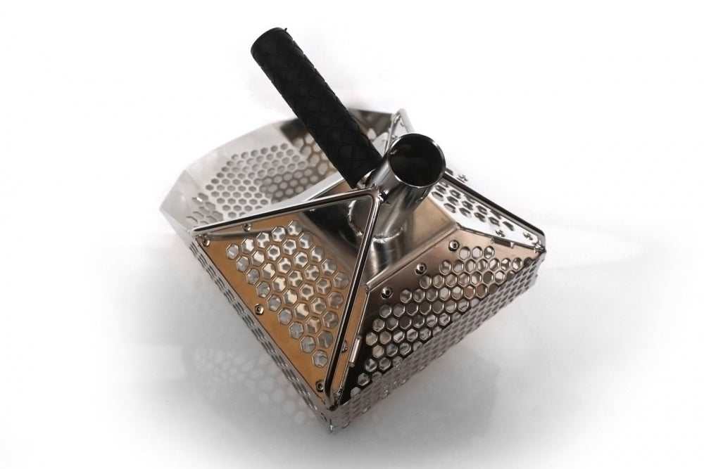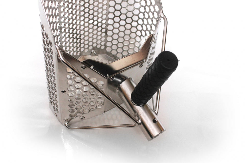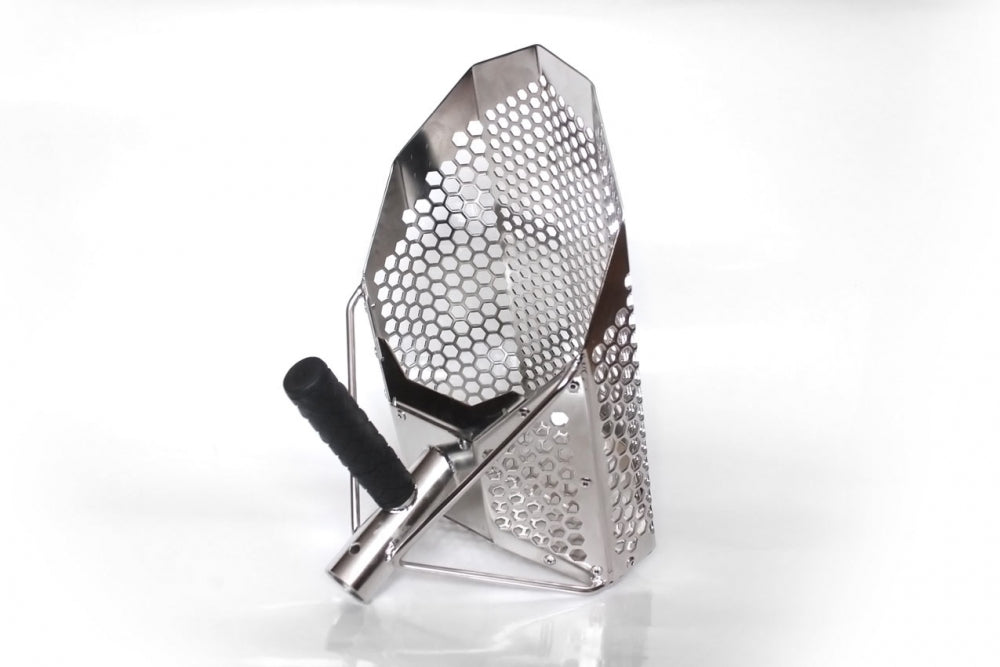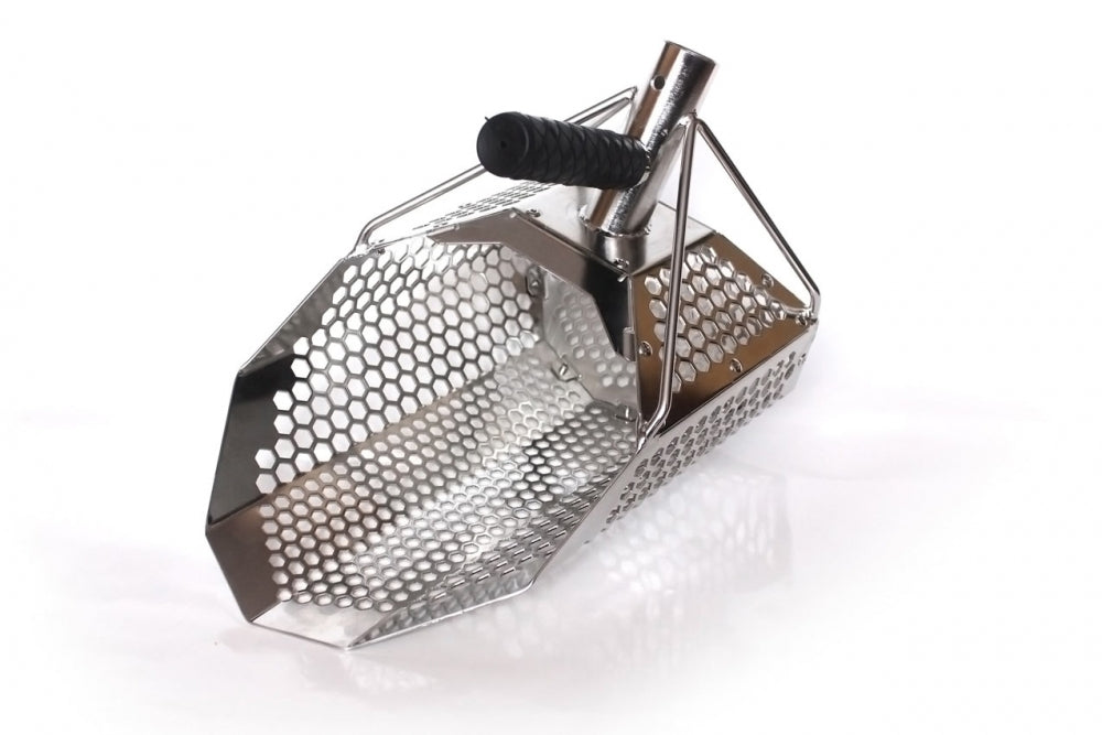 Et meget bra og effektivt sandscoop med 10 og 7mm hexagonale hull. Man tråkker sandscoopet ned i bunnen der du har signal, løfter det opp og rister det (i vannoverflaten) til bare objektet ligger igjen i snadscoopet.