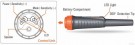 Bruker et 9V "røykvarsler" batteri (batteri medfølger). Opptil 30 timer driftstid (påslått)
